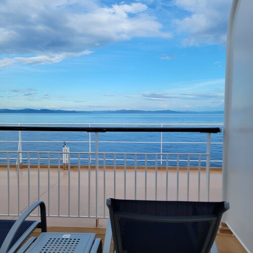 2023年7月13日(木) フェリーライフ おはようございます。昨晩は早く寝たので、6時半ごろに目が覚めました。 まあ体調のほうは相変わらずすぐれず、7割といった感じです。 窓の外はきれいに晴れていて気持ちの良い朝です。 このように陸地が見えているとき…